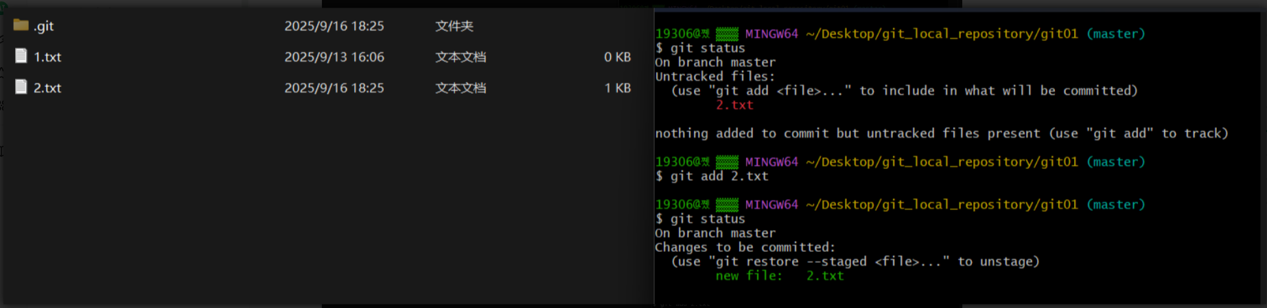 随后执行git add 2.txt将添加到暂存区 在执行 git status 此时显示的是文件提交到暂存区